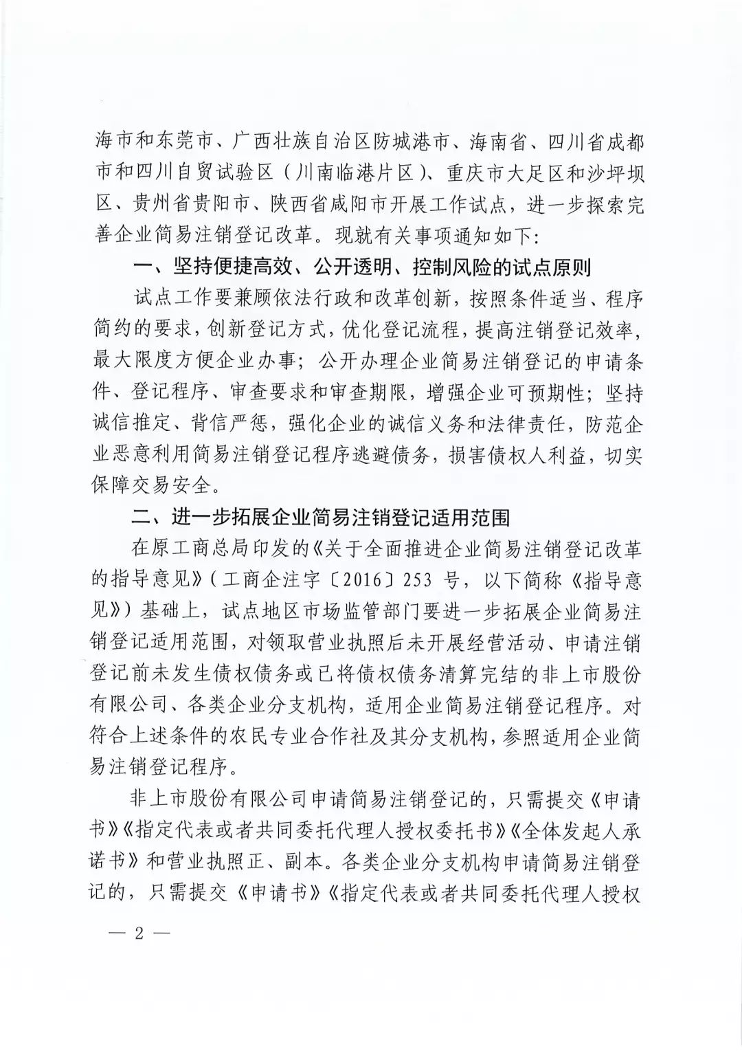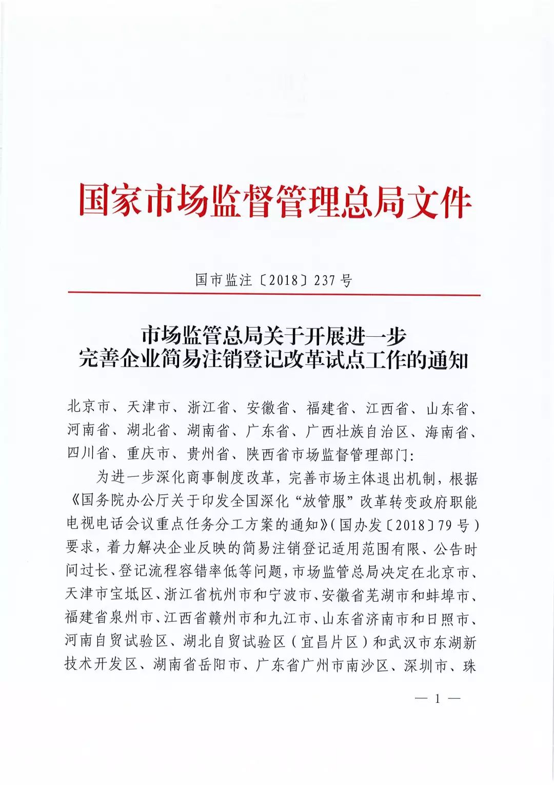 市場(chǎng)監(jiān)管總局關(guān)于開(kāi)展進(jìn)一步完善企業(yè)簡(jiǎn)易注銷(xiāo)登記改革試點(diǎn)工作的通知(國(guó)市監(jiān)注〔2018〕237號(hào))